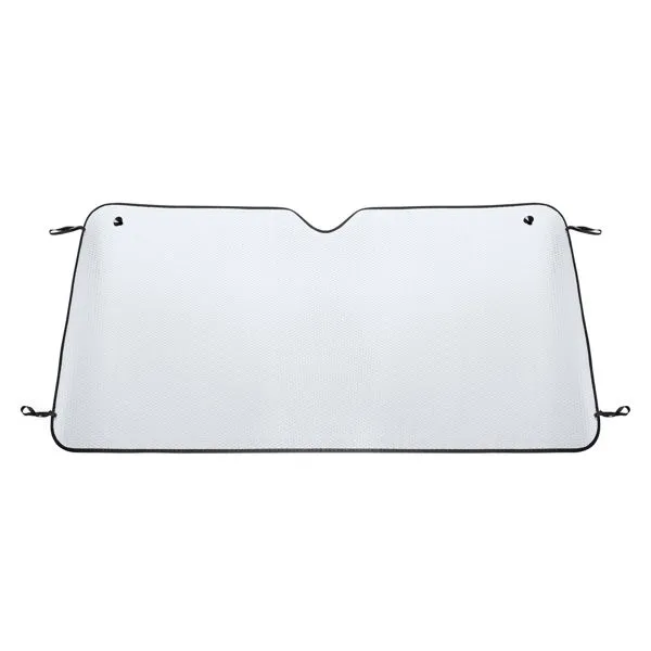 Идеальный большой солнцезащитный экран для грузовиков и микроавтобусов. Обе стороны из пузырчатого алюминия с черной окантовкой. Металлические проушины с присосками и эластичные ремни для складывания прилагаются.