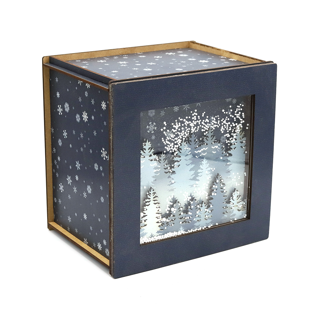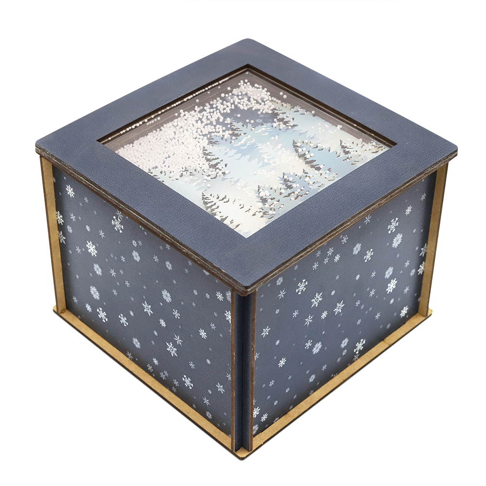 Новогодняя упаковка "Лес в снегу" — это элегантная деревянная коробка темно-синего цвета, оформленная в виде зимнего леса, покрытого снегом. Дизайн подчеркивает праздничное настроение и добавляет атмосферу зимней сказки. Идеально подходит для хранения подарков или сладостей, создавая изысканное и волшебное оформление для новогодних сюрпризов.