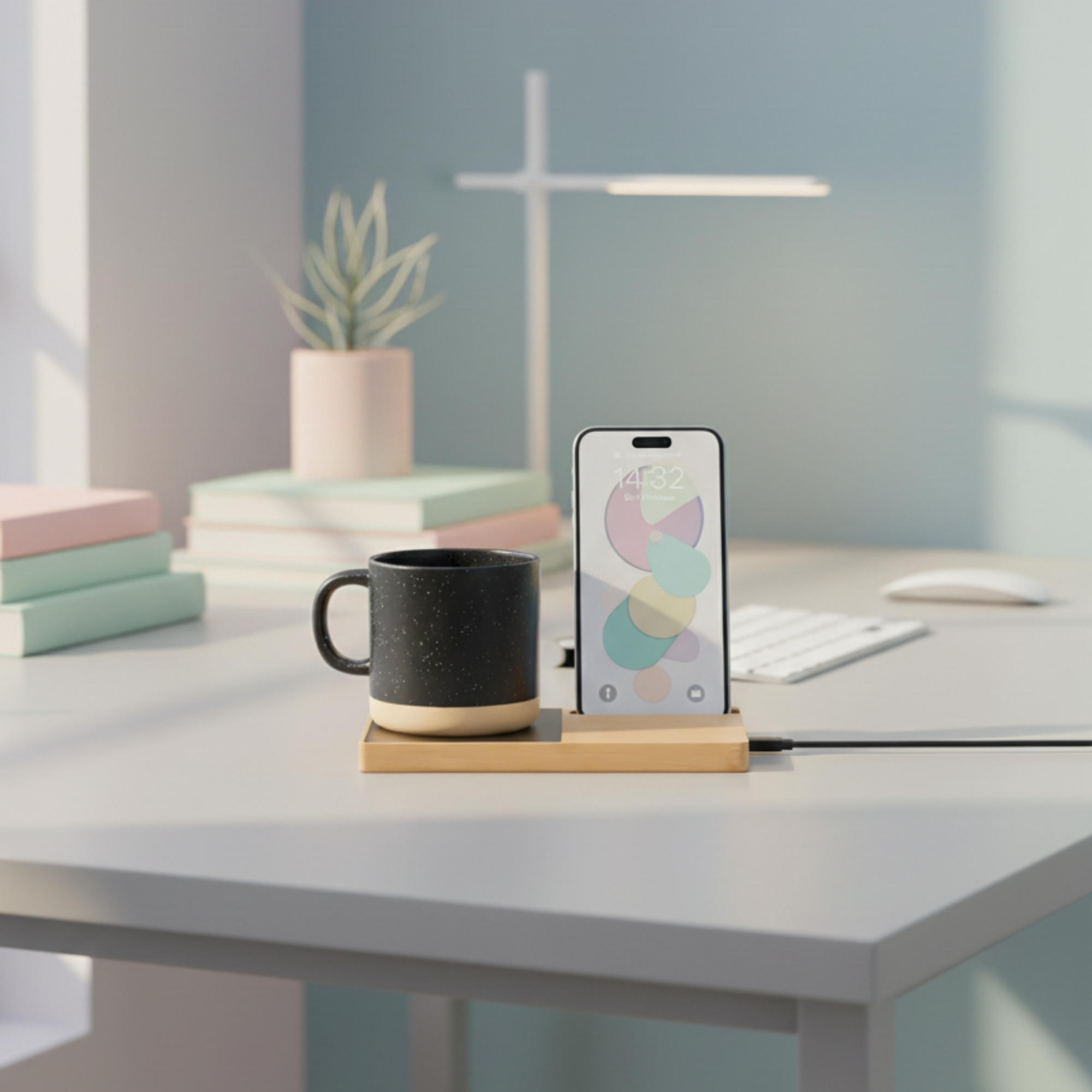 Удобное и функциональное зарядное устройство Allow с функцией подогрева в элегантном светло-коричневом исполнении станет идеальным аксессуаром для вашего рабочего стола или дома.