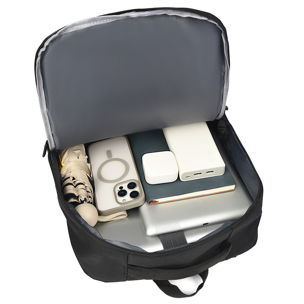 1. РЮКЗАК: Одно большое отделение закрывается молнией о скрытым звеном. На передней стенке скрытый горизонтальный карман на молнии по бокам открытый карман и USB-разъем с проводом для подключения внешнего аккумулятора.