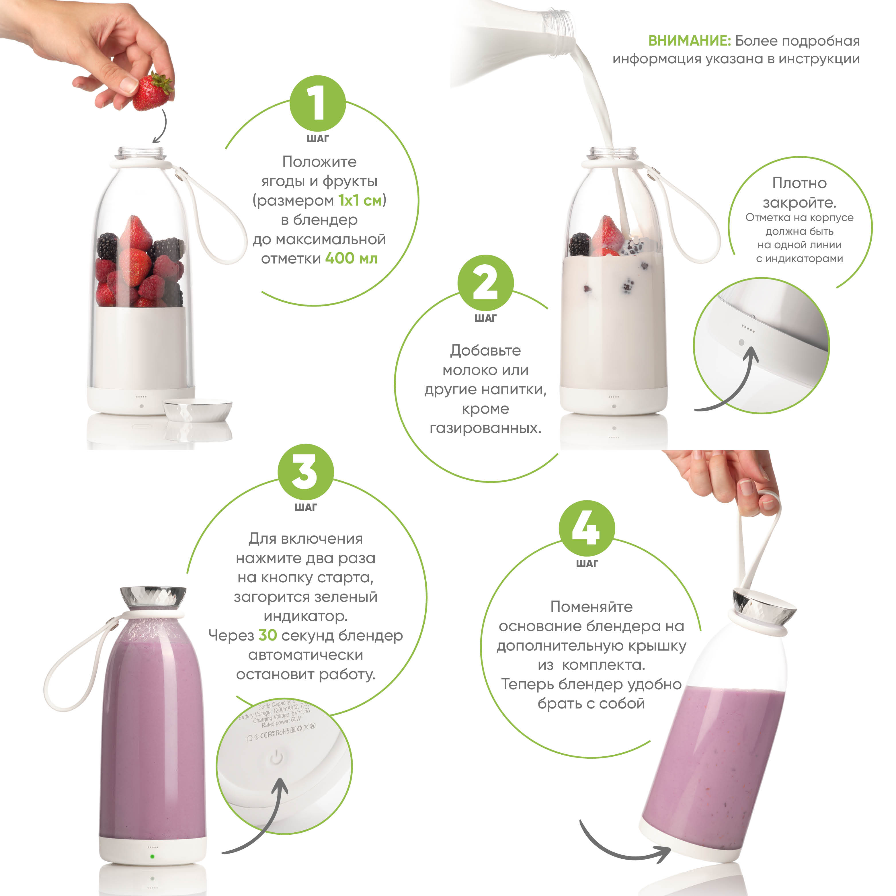 Перед первым использованием вымойте бутылку и основание блендера с помощью мягких моющих средств, далее насухо вытрите. Не оставляйте основание блендера надолго в воде.