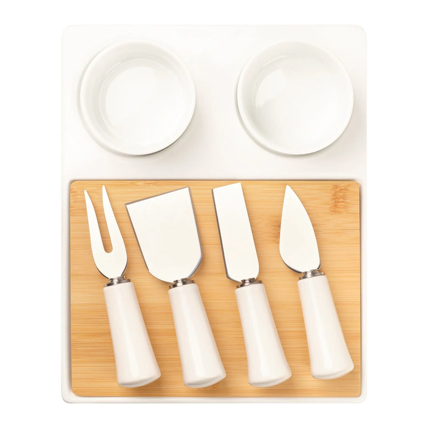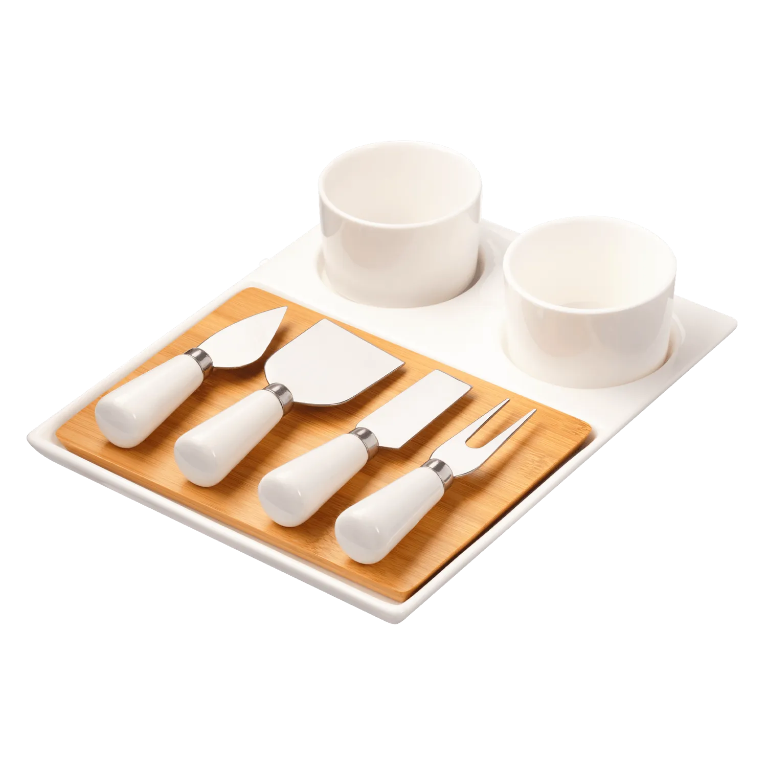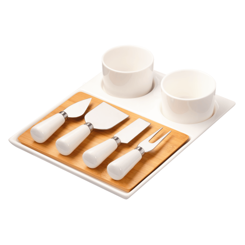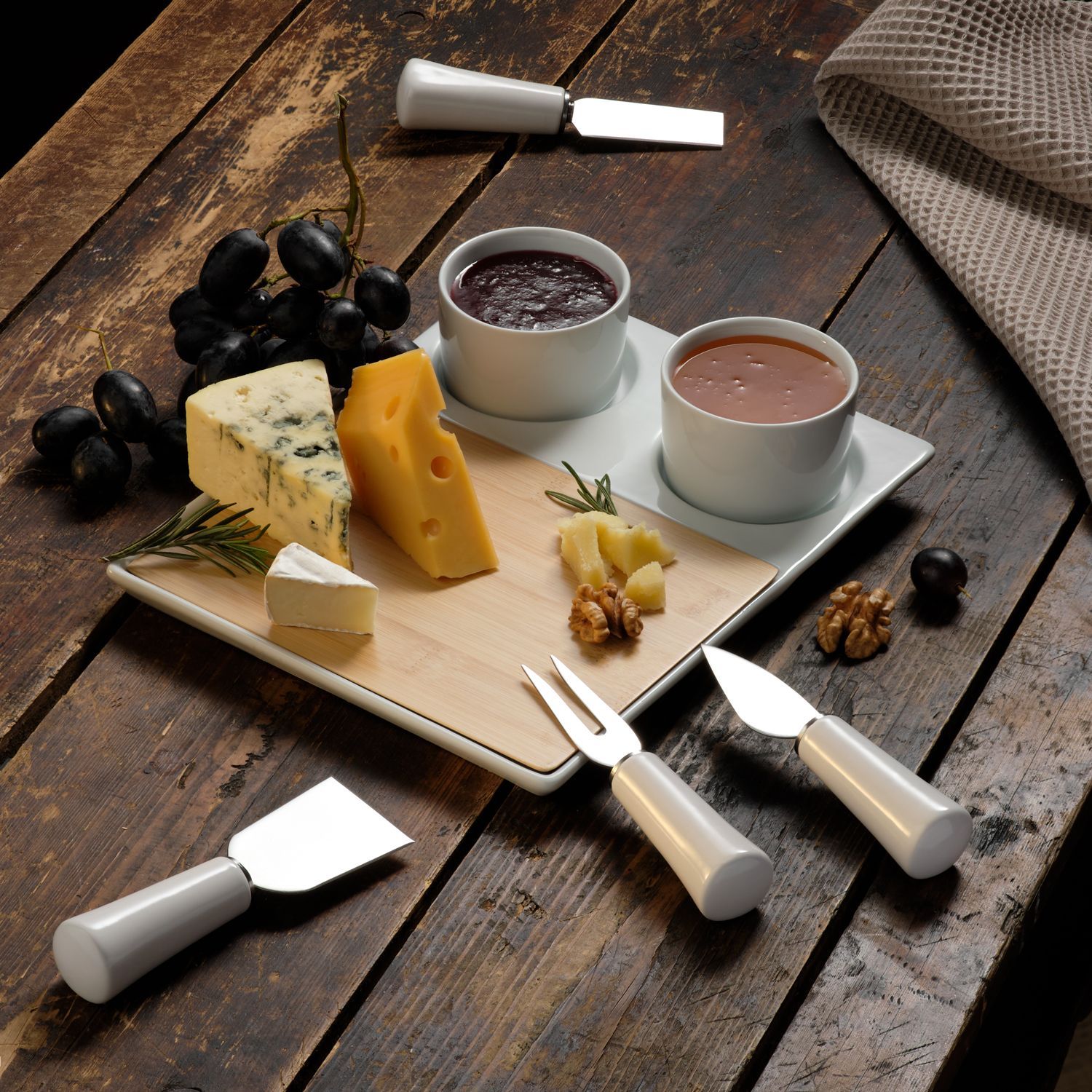 Набор подойдет для эстетичной сервировки и подачи любимых сыров или других закусок. Разные виды ножей помогут не смешивать вкусы мягких свежих и твердых сыров. Соусницы идеально подойдут для меда или варенья. В набор вложена инструкция, благодаря которой легко разобраться в назначении каждого из ножей.