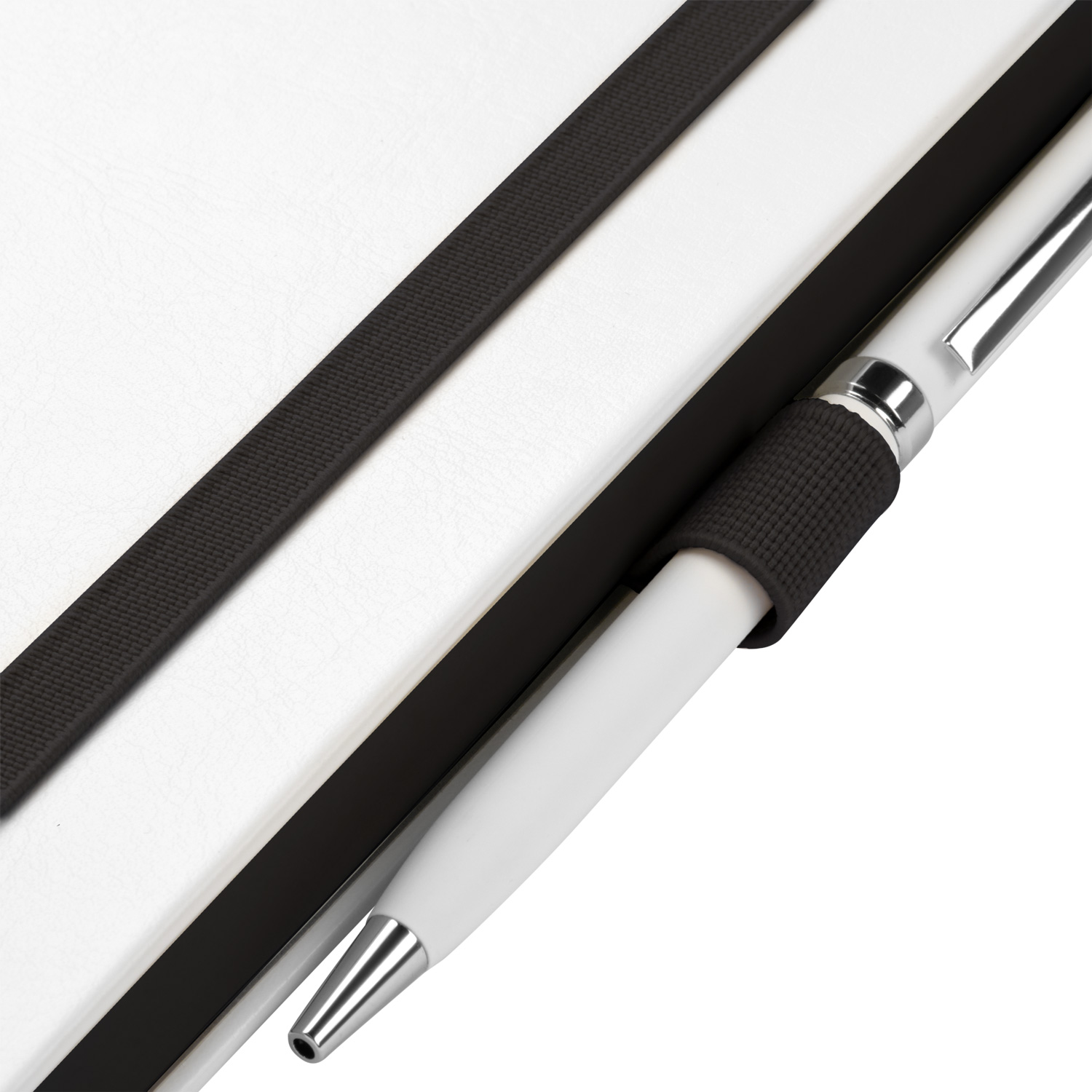 Недатированный ежедневник выполнен в жесткой обложке из искусственной кожи со скругленными уголками. Переплетный материал гладкий, с легкой естественной паутинкой морщин, имеет полуглянцевый блеск. Цвет – чистый белый. Черные матовые форзац и нахзац, а также черный срез блока создают оригинальный динамичный цветовой ансамбль и подчеркивают белизну обложки. Страницы светло-кремового цвета, из гладкого офсета, слегка шелковистые, со скругленными уголками. Добавляют изделию мягкую комфортную теплоту. Двойное атласное ляссе составлено из черной и белой лент. Каждая шириной 6 мм, имеет легкий блеск. Вертикальная фиксирующая резинка прочная, надежная и удобная, в тон срезу. Есть петелька для ручки в тон резинки. Карман на заднем форзаце.