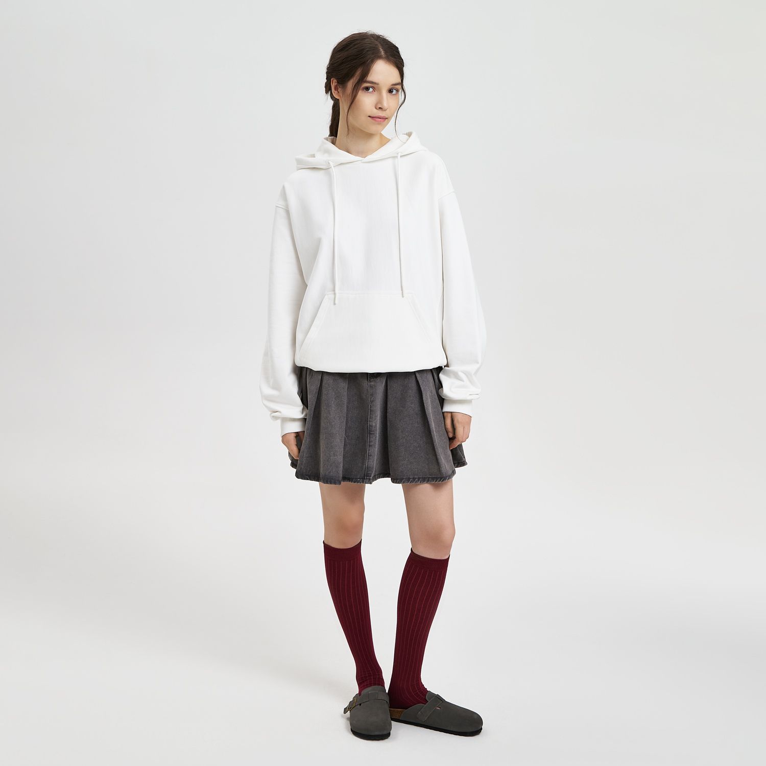 Модель выполнена из хлопкового футера плотностью 420 г/м (без начёса). Плотная, но мягкая ткань хорошо держит форму и при этом приятна к телу. Использована пряжа compact penye — прочная, тактильно деликатная, высокого качества.
