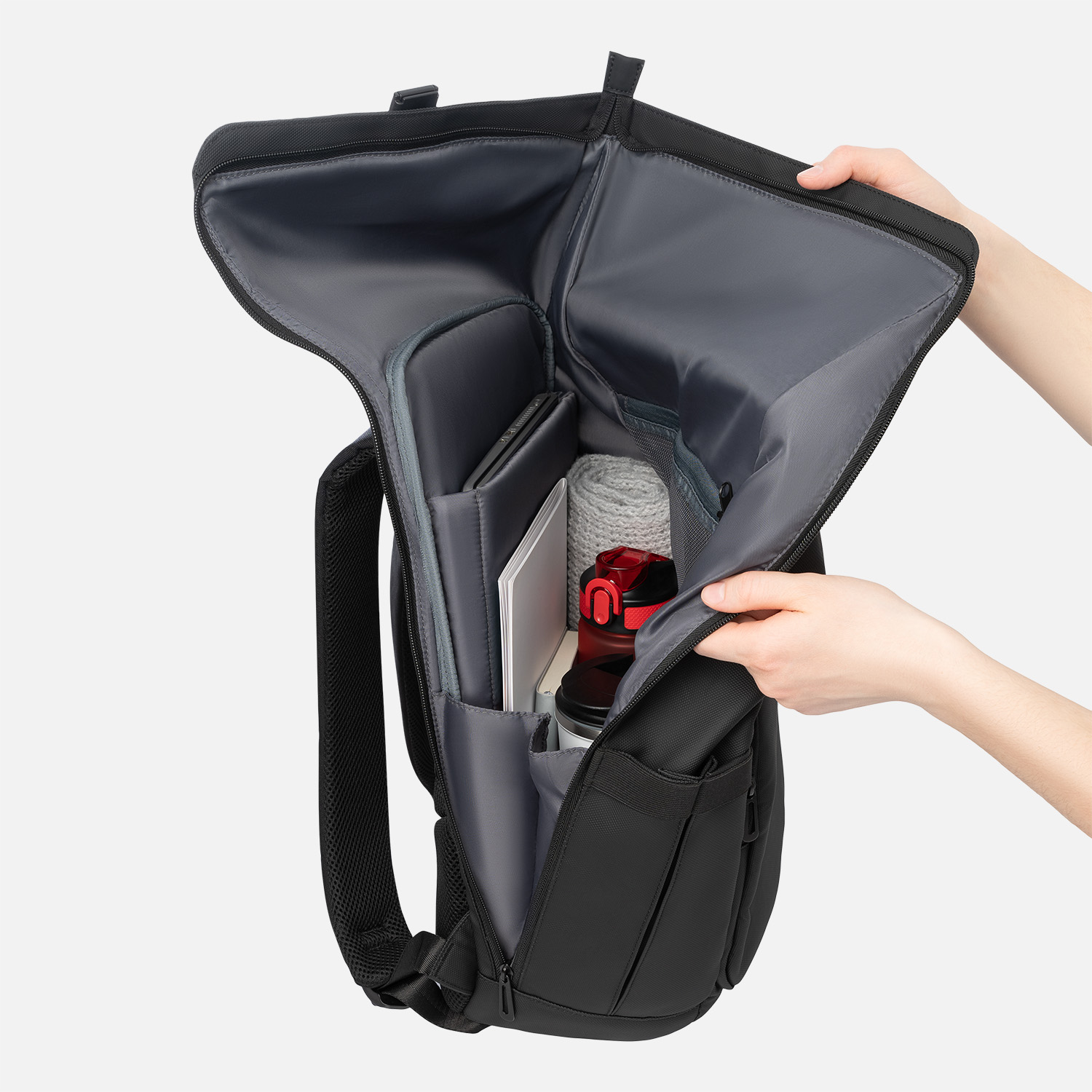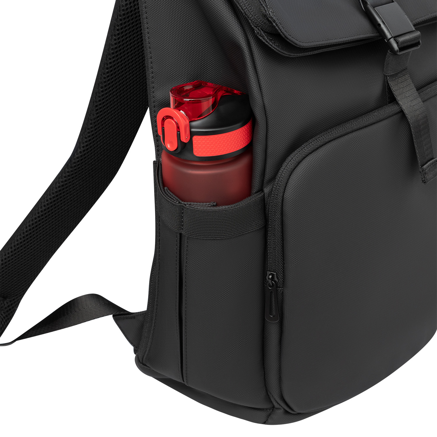 Боковые карманы с эластичными фиксаторами надежно удерживают содержимое. Спинка и мягкие плечевые ремни с дышащей сеточкой обеспечивают комфорт даже при длительном ношении, а багажная лента делает рюкзак удобным спутником в путешествиях.