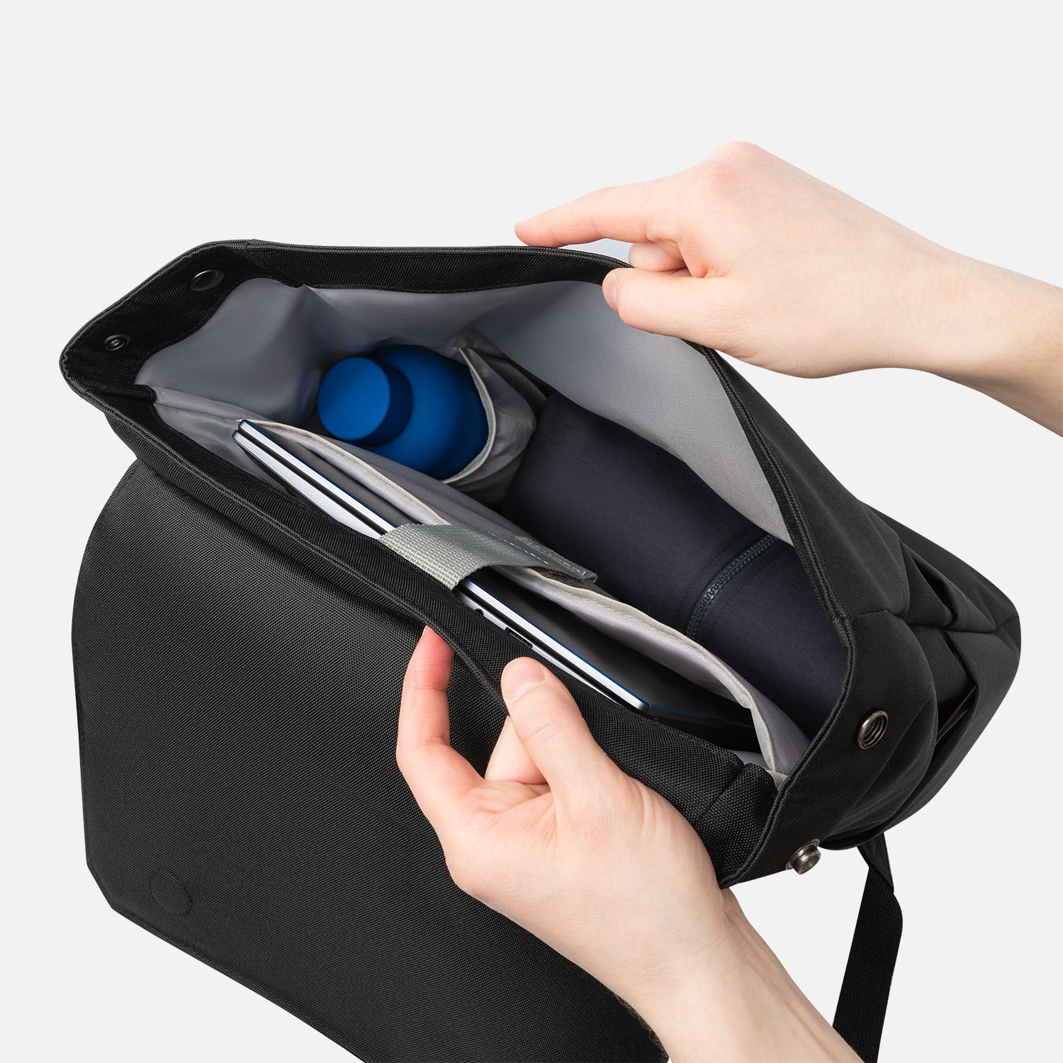 Основное отделение вмещает ноутбук до 15,6 дюймов в уплотненном кармане с фиксирующим ремнем на липучке. Внутри основного отделения есть карман для фиксации пластиковой бутылки или небольшого термоса. Боковые карманы разного типа — один объемный на молнии, второй плоский — позволяют удобно разместить все необходимые вещи.