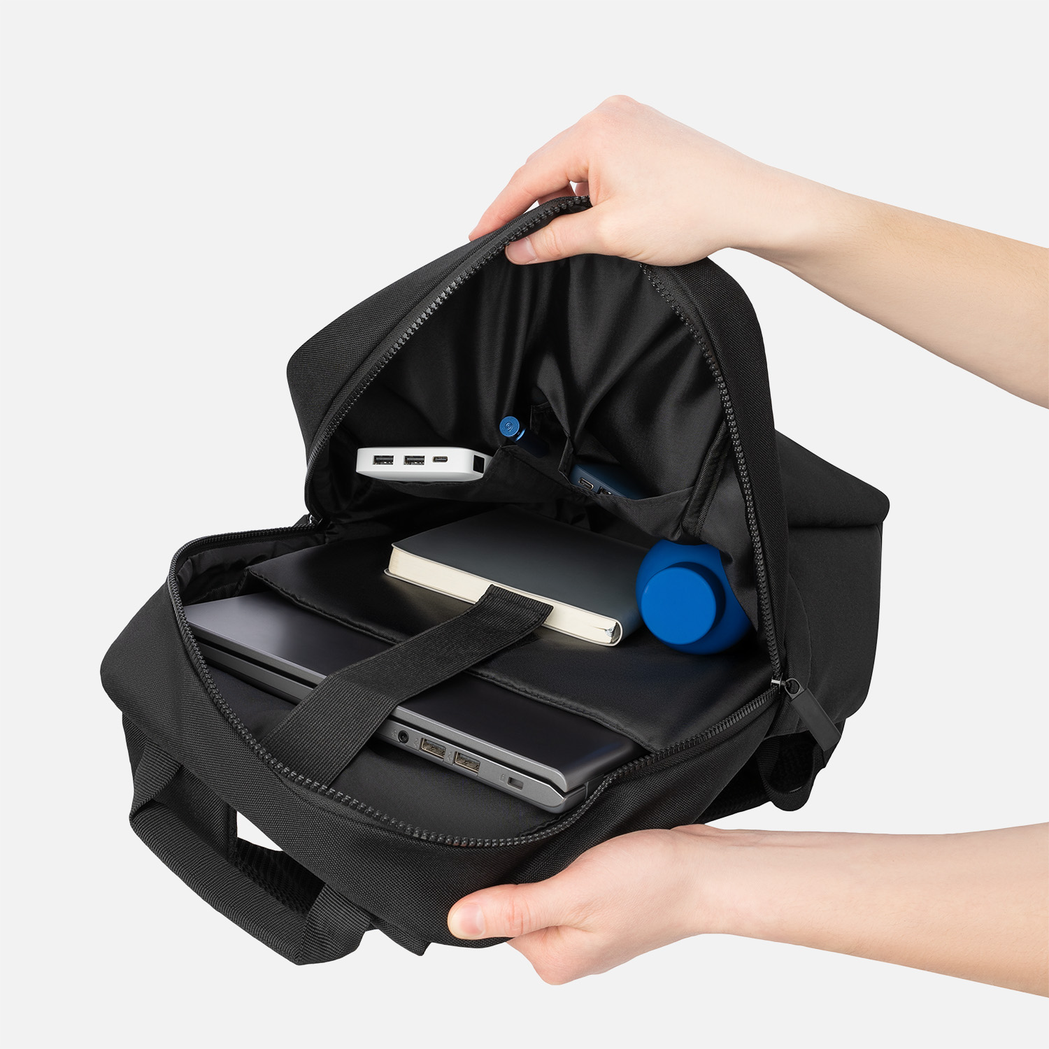 Вместительные передние карманы, один из которых на скрытой молнии, позволяют хранить самые нужные вещи под рукой. Боковые карманы с эластичными фиксаторами надежно удерживают бутылку и другие предметы. Основное отделение оснащено карманом для ноутбука до 15,6” с защитным ремнем; два кармана для мелочей и отдельные отсеки для ручек помогают организовать все необходимое внутри рюкзака.