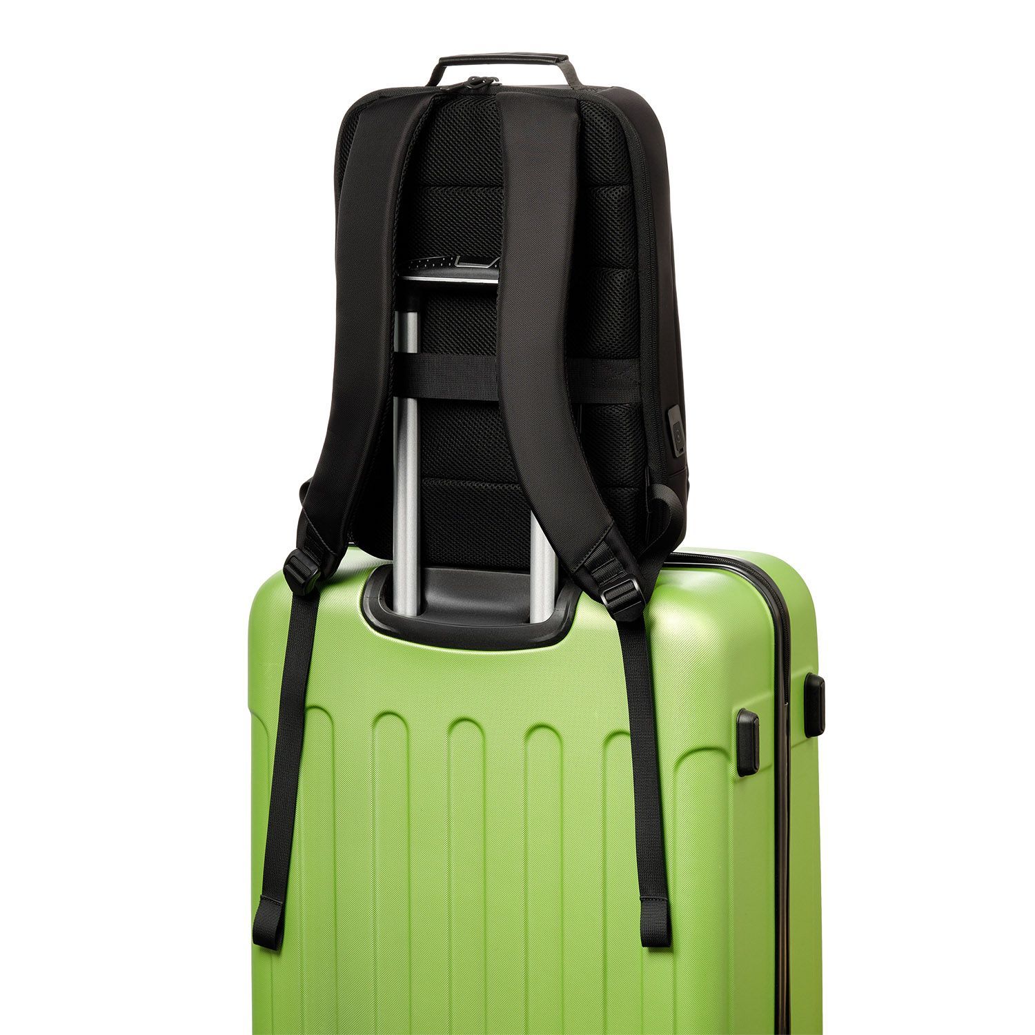 Ноутбук разместится в глубоком кармане внутри основного отделения рюкзака, также предусмотрены два небольших кармашка для мелочей. Основное отделение закрывается на двойную молнию. С лицевой стороны вместительный карман на молнии. На спинке широкая багажная лента для закрепления на ручке чемодана и потайной карман на молнии. Лямки — широкие, регулируемые по длине. Они хорошо облегают плечи и равномерно распределяют нагрузку.