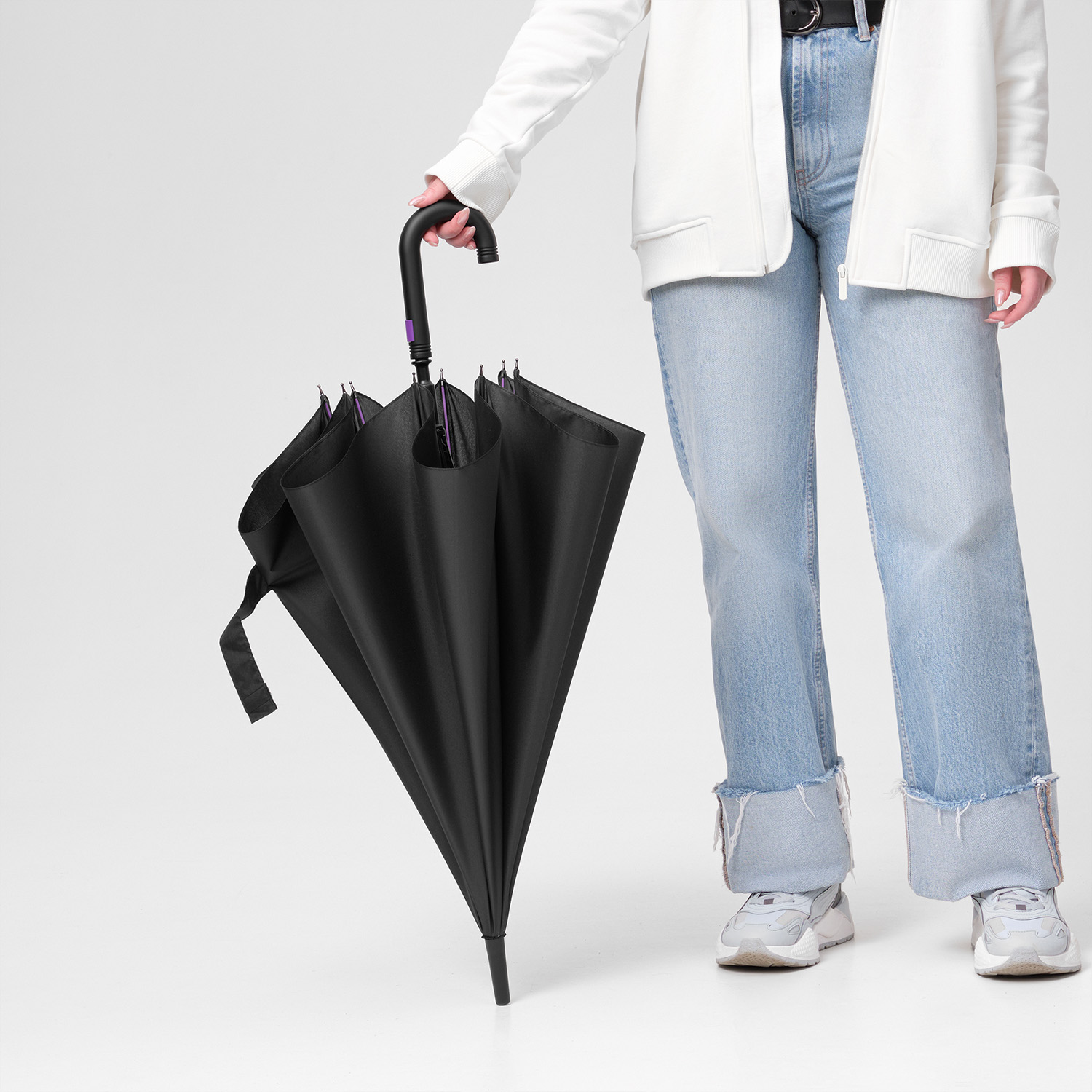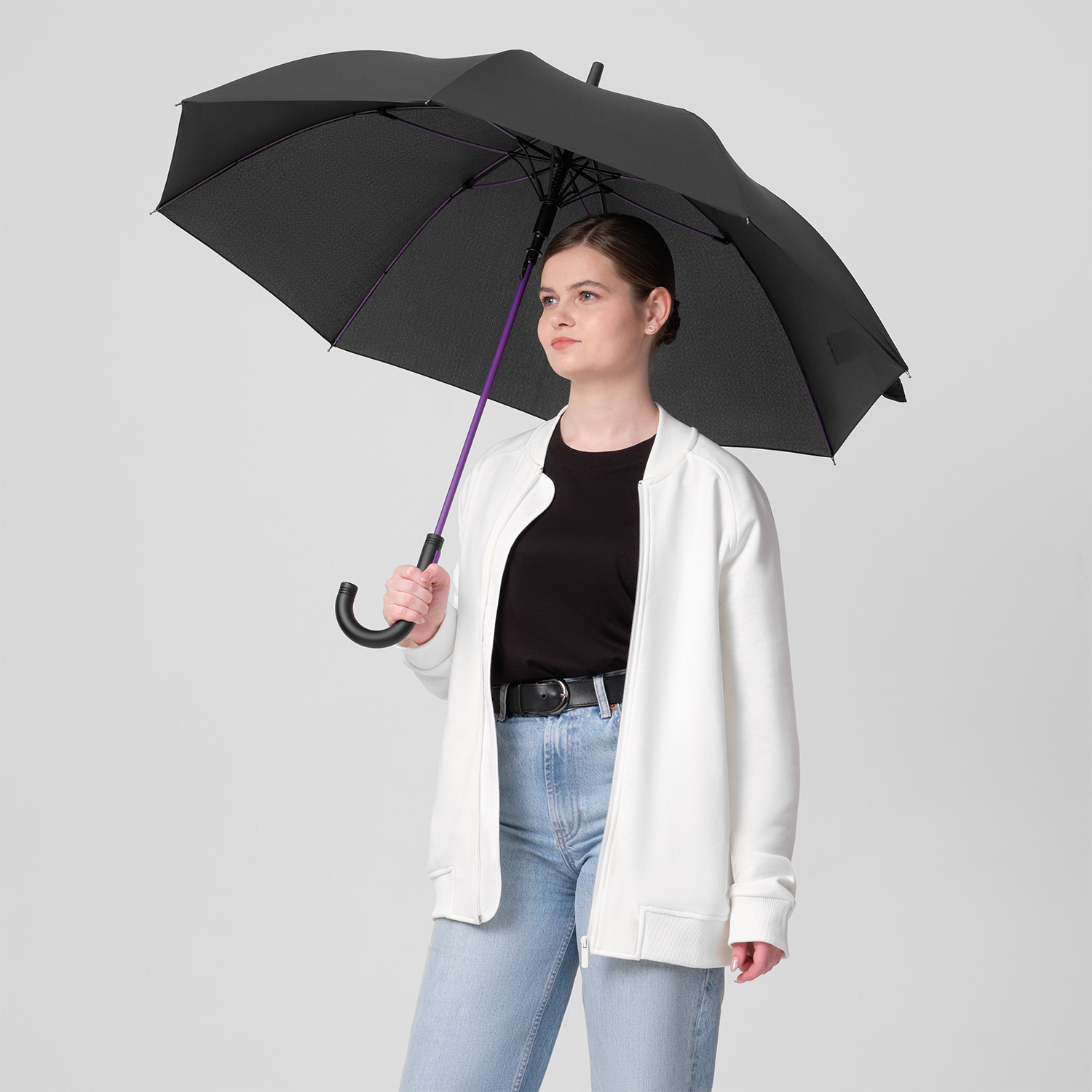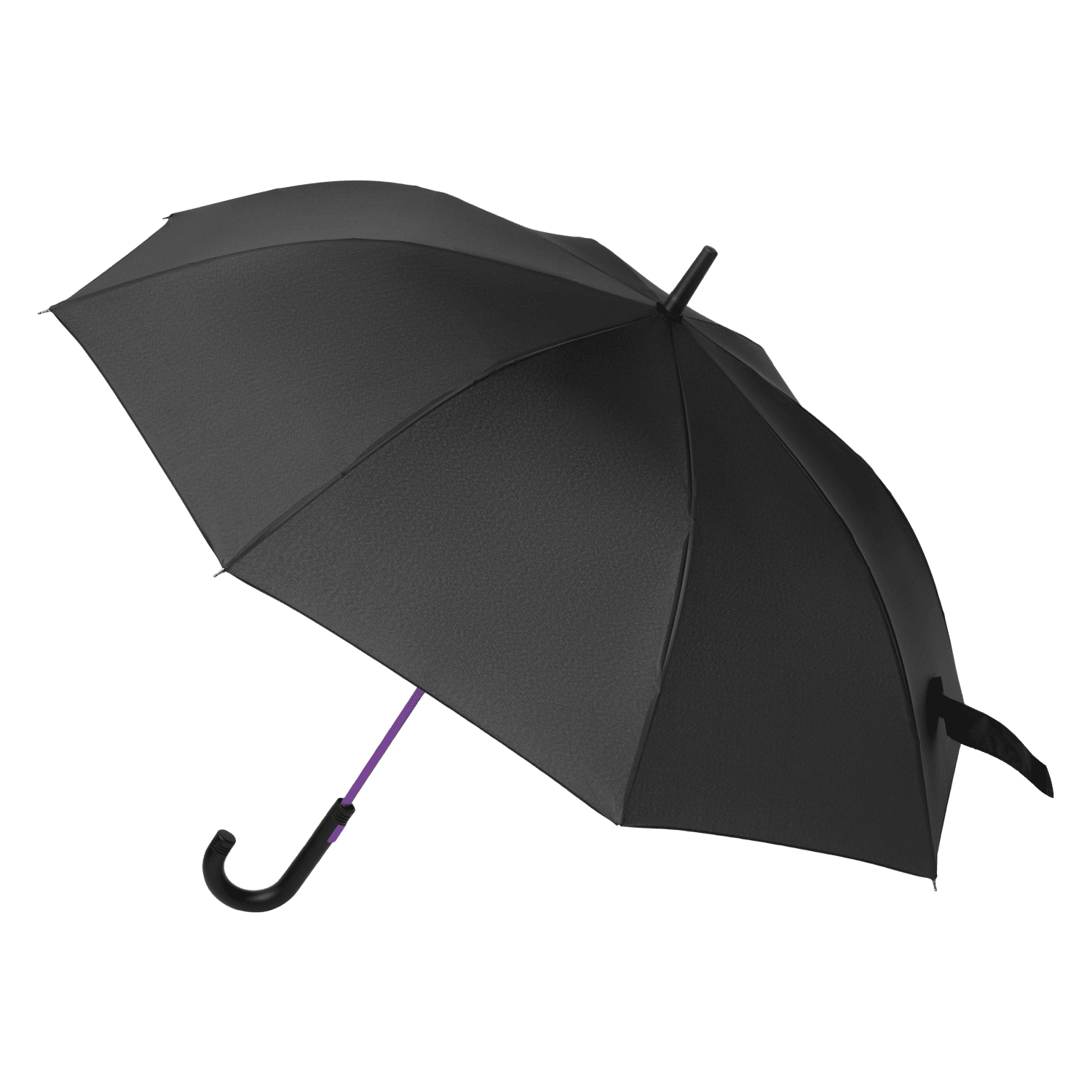 Полуавтоматический зонт быстро раскрывается при нажатии на кнопку. Контрастные цветные спицы окрашены в тон трости и кнопки на ручке. Зонт оснащен гибкими спицами с конструкцией антиветер, которая защищает зонт от поломок при резких порывах ветра. PU-покрытие на ручке зонта обеспечивает комфортное и долговечное использование аксессуара: оно устойчиво к истиранию, не скользит в руке и не становится липким.