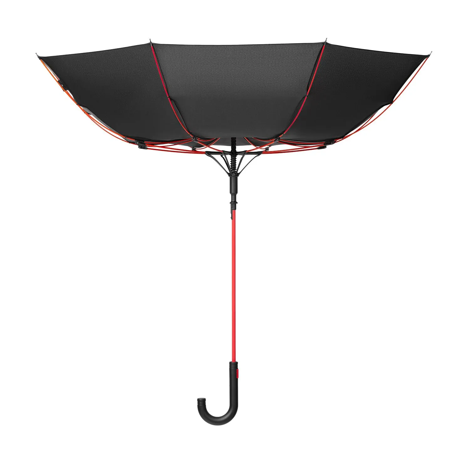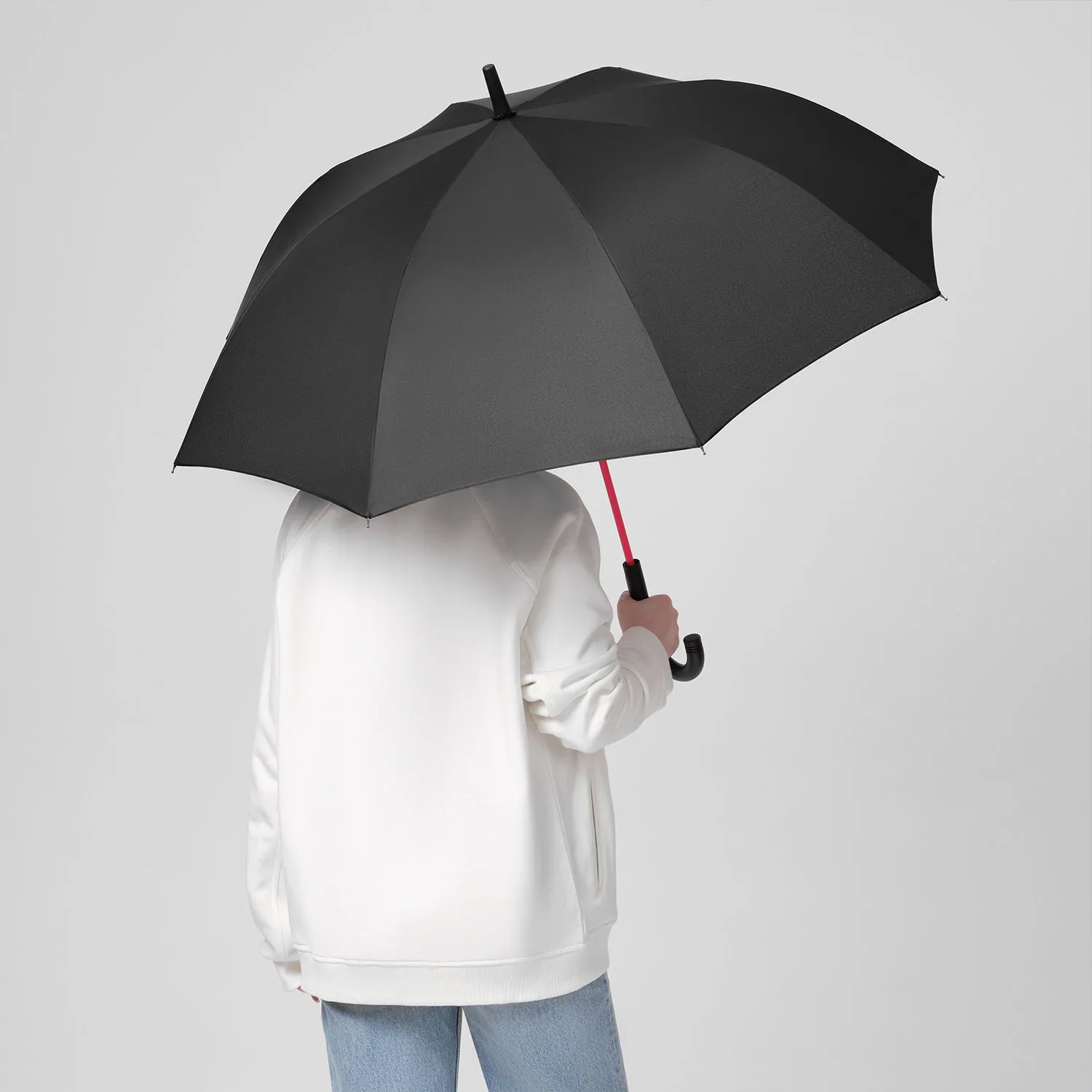 Полуавтоматический зонт быстро раскрывается при нажатии на кнопку. Контрастные цветные спицы окрашены в тон трости и кнопки на ручке. Зонт оснащен гибкими спицами с конструкцией антиветер, которая защищает зонт от поломок при резких порывах ветра. PU-покрытие на ручке зонта обеспечивает комфортное и долговечное использование аксессуара: оно устойчиво к истиранию, не скользит в руке и не становится липким.