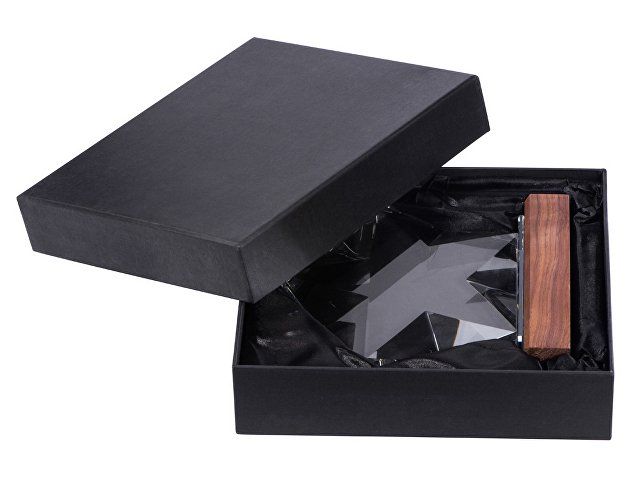Награда выполнена из прозрачного стекла в виде звезды и расположена на деревянном постаменте. Благодаря выпуклым сторонам она интересно переливается в лучах света.