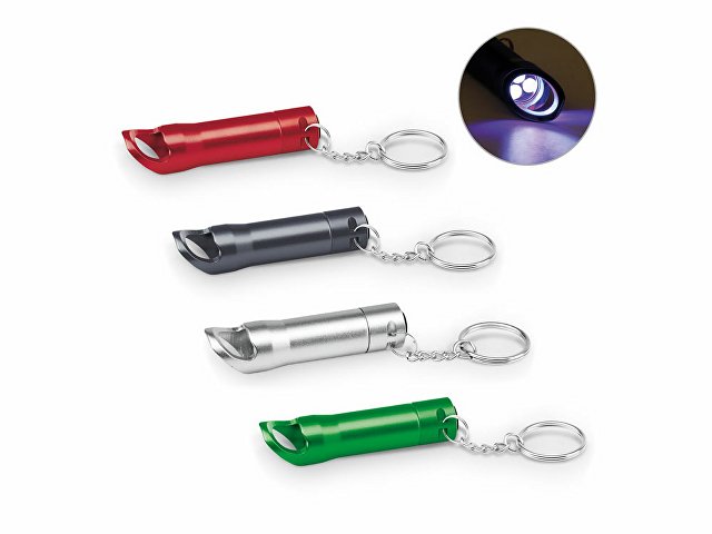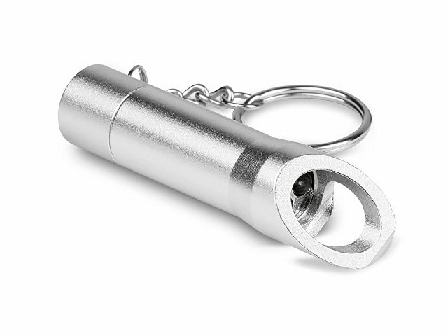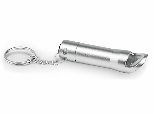Металлический фонарь с 3 светодиодами, открывалкой и кольцом для ключей. Включает 3 батареи LR44. ø18 x 72 мм