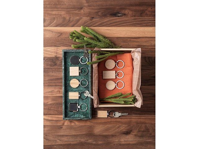 Круглый брелок из буковой древесины. Поставляется в коричневой упаковке из шрифтовой бумаги.