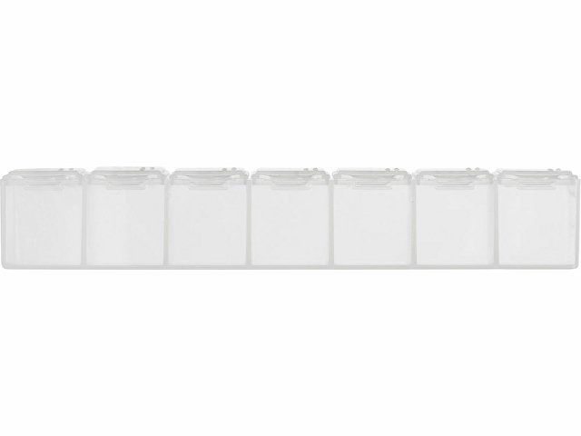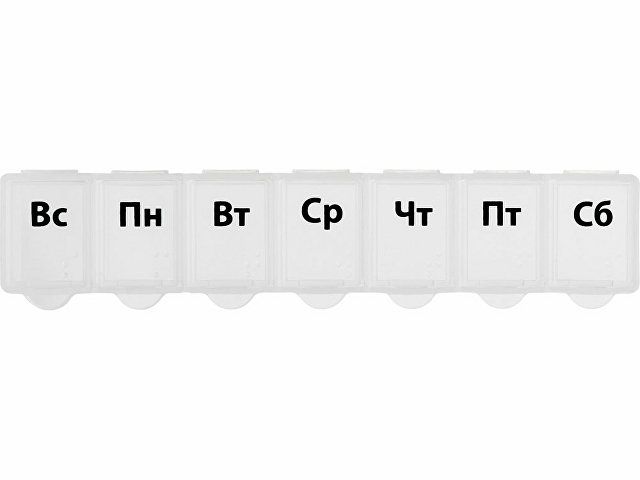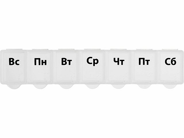 Таблетница с днями недели. Надписи продублированы шрифтом Брайля на английском языке.