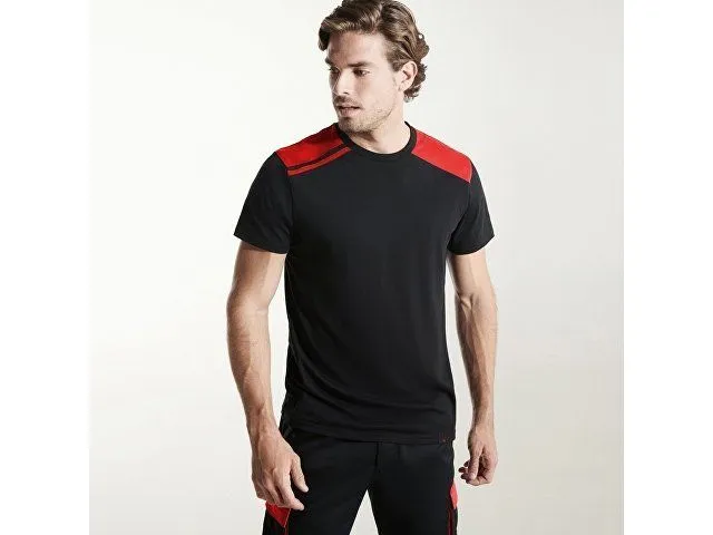 Футболка с короткими рукавами. Круглая горловина с контрастными закрытыми внутренними швами. Контрастные плечевые вставки и детали.