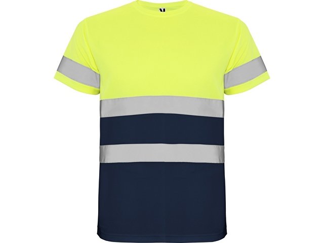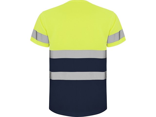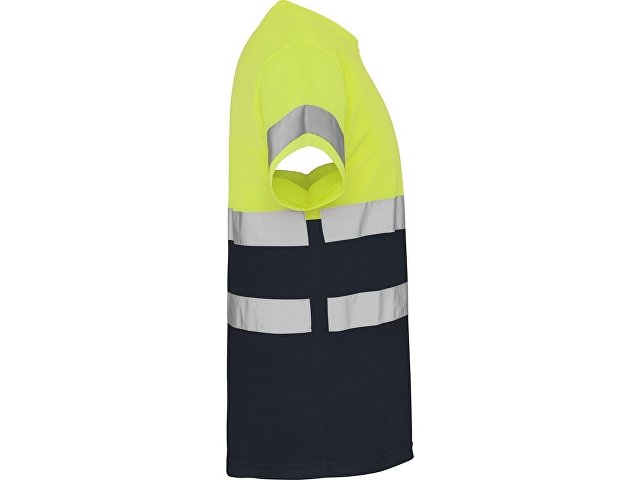 Футболка со светоотражающими элементами с короткими рукавами. Круглая горловина из той же ткани, с усиленными закрытыми швами на внутренней стороне горловины. Две горизонтальные светоотражающие полосы на туловище и одна светоотражающая полоса на рукавах.