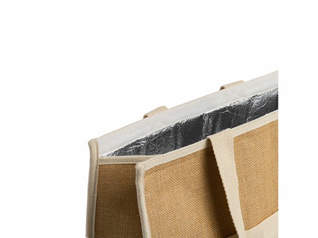 Сумка-холодильник из ламинированного джута. Изотермическая алюминиевая подкладка и застежка на липучке. Держите напитки и еду при соответствующей температуре. Передний карман и ручки из натурального хлопка.