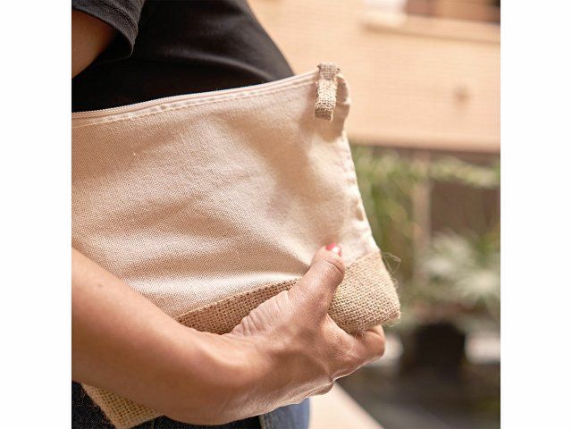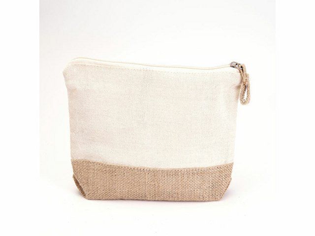 Эко-косметичка из хлопка и джута плотностью 180 г/м² натурального цвета с нижней частью и язычком из джута и застежкой-молнией в тон.