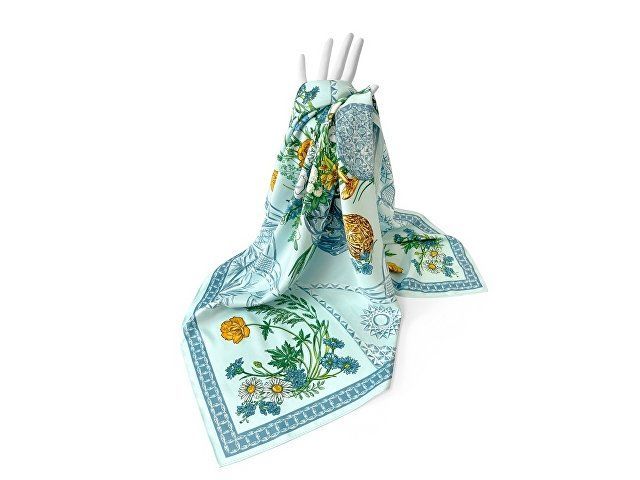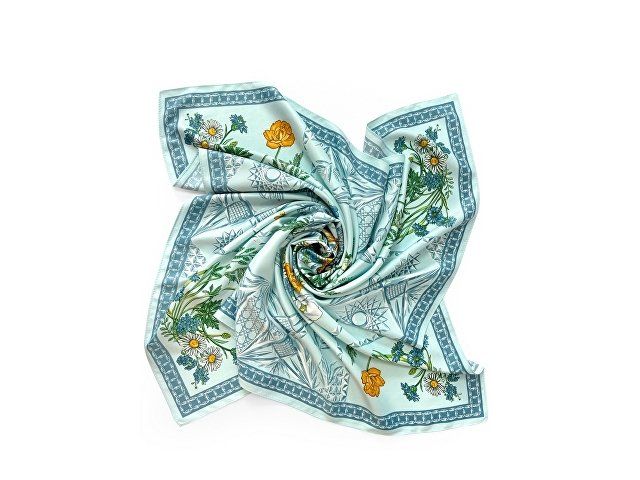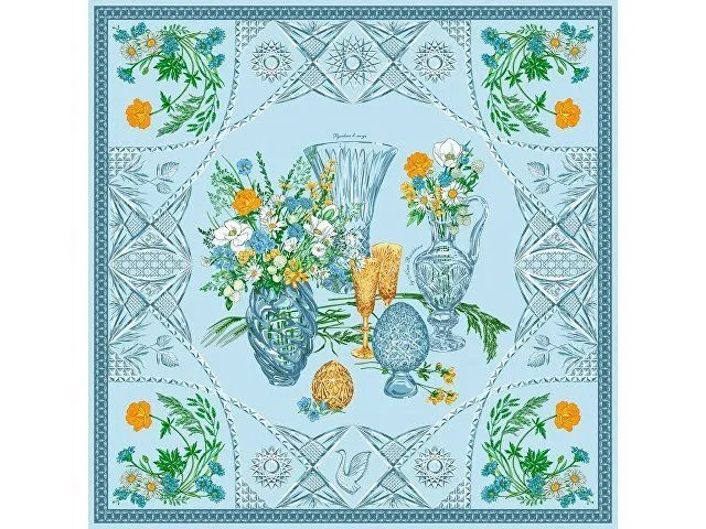 Дизайн платка связан со стилевой эстетикой советской школы натюрморта. Перед нами ажурная скатерть стола, декорированного композицией из хрусталя и полевыми цветами. Нежные переливы сине-голубых тонов подчеркнуты ярко-желтыми и белыми бутонами, стеблями сочных трав и золотистыми бокалами. Ажур скатерти вторит хрустальному узору фужеров, ваз и сувенирных пасхальных яиц, задавая душевное настроение.