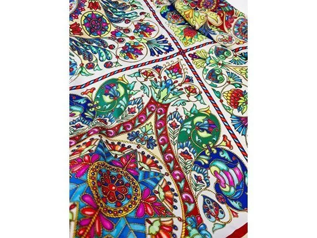 Платок “Русская эмаль” — это атрибут нежных и утончённых женщин, покоряющих мужские сердца. Его принт с мягкими обтекаемыми линиями и многообразием оттенков навеян мотивами старинного русского промысла — росписи металла горячей эмалью, которой еще в XI-XII веках украшали посуду, ювелирные изделия, книги и табакерки. Яркие синие, красные, зеленые и голубые цвета гармонично сочетались с драгоценными камнями и металлами в творениях Карла Фаберже.