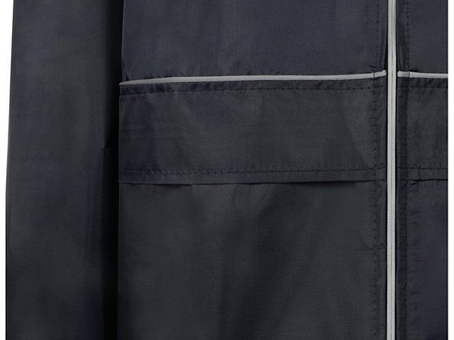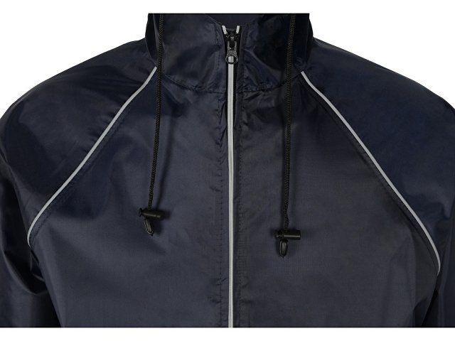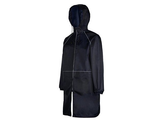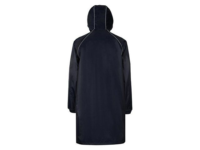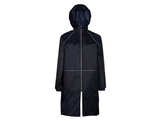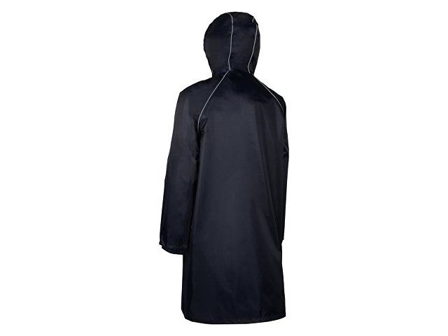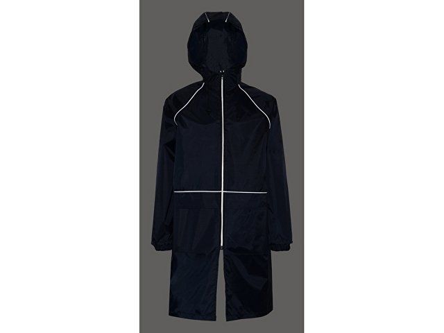 Плащ-дождевик прямого силуэта с капюшоном и рукавом реглан. Застегивается на центральную молнию со светоотражающей полосой с внутренней ветрозащитной планкой. Накладные карманами с клапанами. Двухшовный капюшон с кулиской по краю. Низ рукавов обработан манжетами с внутренней резинкой для комфортной посадке в области запястья. Верхний край клапана кармана, швы капюшона, а также регланные линии обработаны светоотражающим кантом.