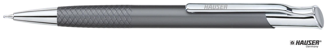 Шариковая ручка с нажимным механизмом. Корпус металлический, глянцевый с фигурной зоной грифа с хромироавнной отделкой. Стержень тонкий пластиковый с синей пастой, 0,5 мм