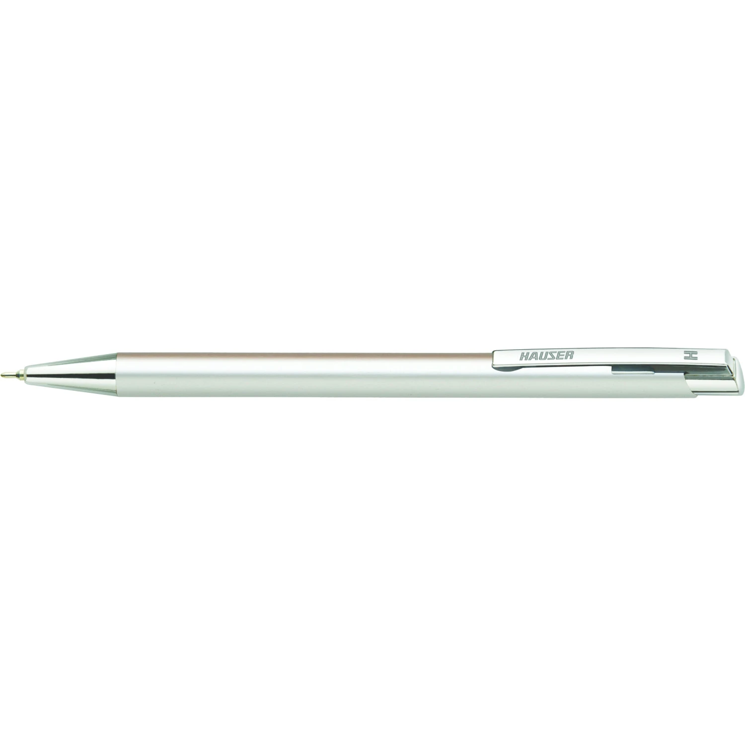 Шариковая авторучка, с нажимным механизмом . Корпус металлический с глянцевой хромированной отделкой .Стержень тонкий пластиковый с синей пастой . Толщина линии 0,5 мм